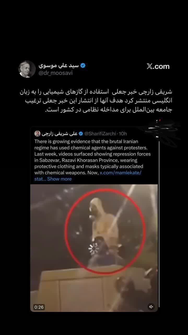 مثلاً آقای علی شریفی زارچی، پدر خوردن همزمان از توبره و آخور ایران، بعد از ترک ایران، ویدیویی جعلی رو همراه با متنی انگلیسی در ایکس منتشر میکنن و ادعا میکنند رژیم سفاک ایران علیه معترضین از گازهای شیمیایی استفاده کرده. کاری که با سوریه کردند؛ ادعای دروغ استفاده از گازهای شیمیایی رو رواج دادند و سوریه رو مورد حمله قرار دادند و در نهایت به این وضعیت دچارش کردند.
